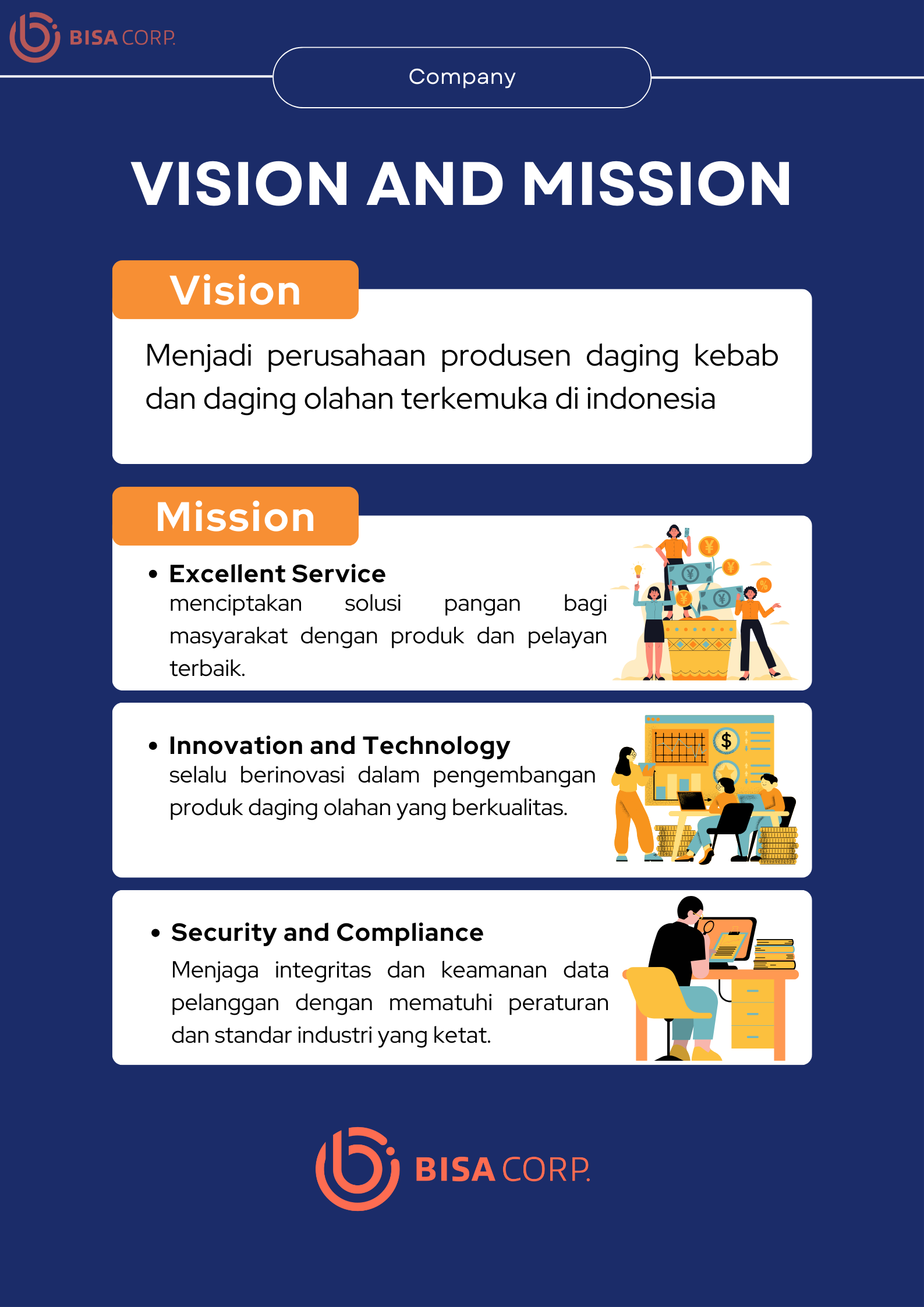Dalam industri pangan yang semakin kompetitif, terutama di sektor daging olahan dan kebab, kejelasan visi dan misi menjadi fondasi utama bagi setiap perusahaan yang ingin bertahan dan berkembang. BISA CORP hadir dengan tekad untuk tidak hanya menjadi pemain, tetapi pemimpin pasar di Indonesia melalui pendekatan yang terintegrasi, inovatif, dan bertanggung jawab.