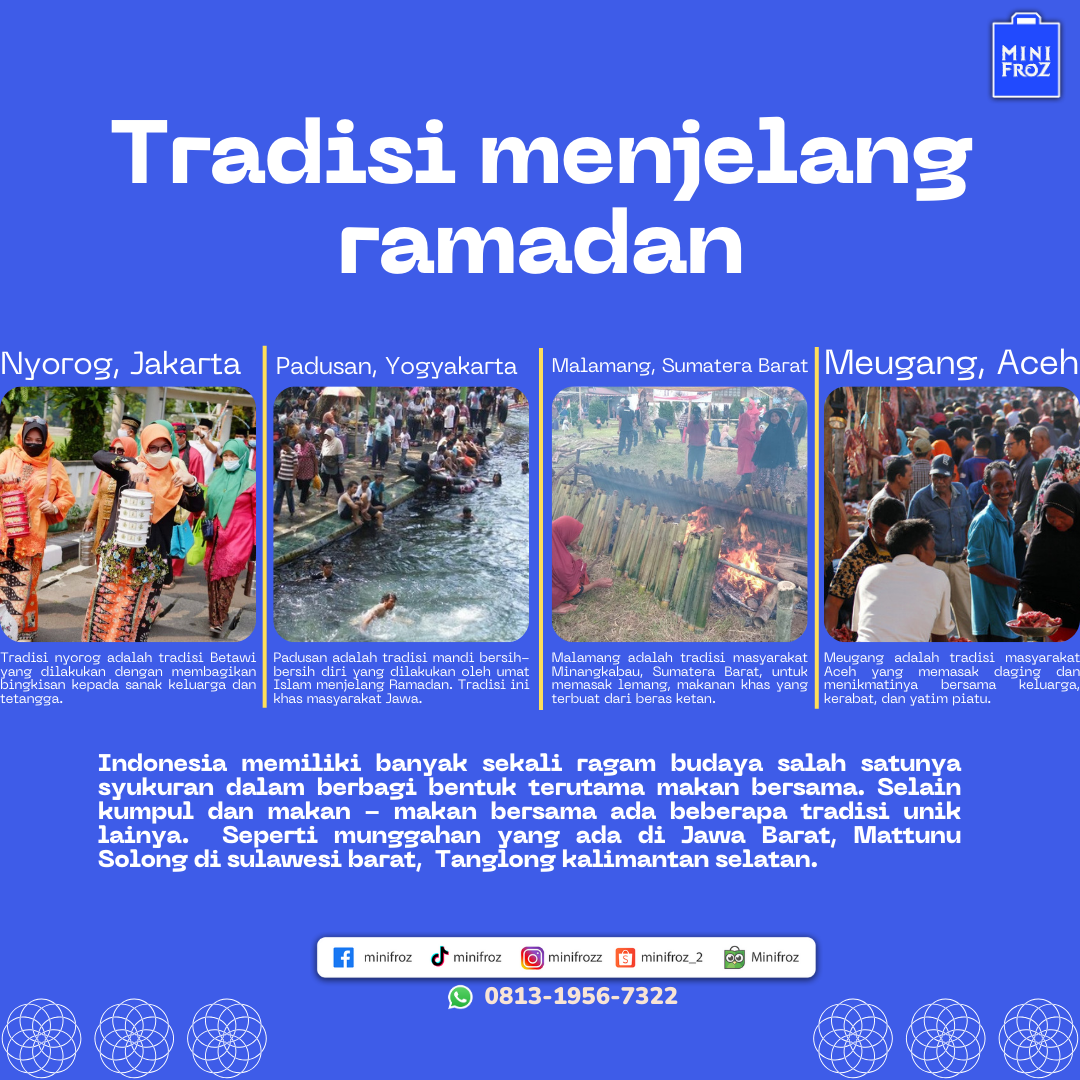 Indonesia memiliki kekayaan budaya yang luar biasa, salah satunya terlihat dari ragam tradisi syukuran menjelang Ramadan. Meski berbeda-beda bentuknya—mulai dari makan bersama, berbagi makanan, hingga ritual pembersihan diri—semua tradisi ini memiliki satu benang merah: menyucikan hati, mempererat tali persaudaraan, dan bersyukur atas datangnya bulan penuh berkah.