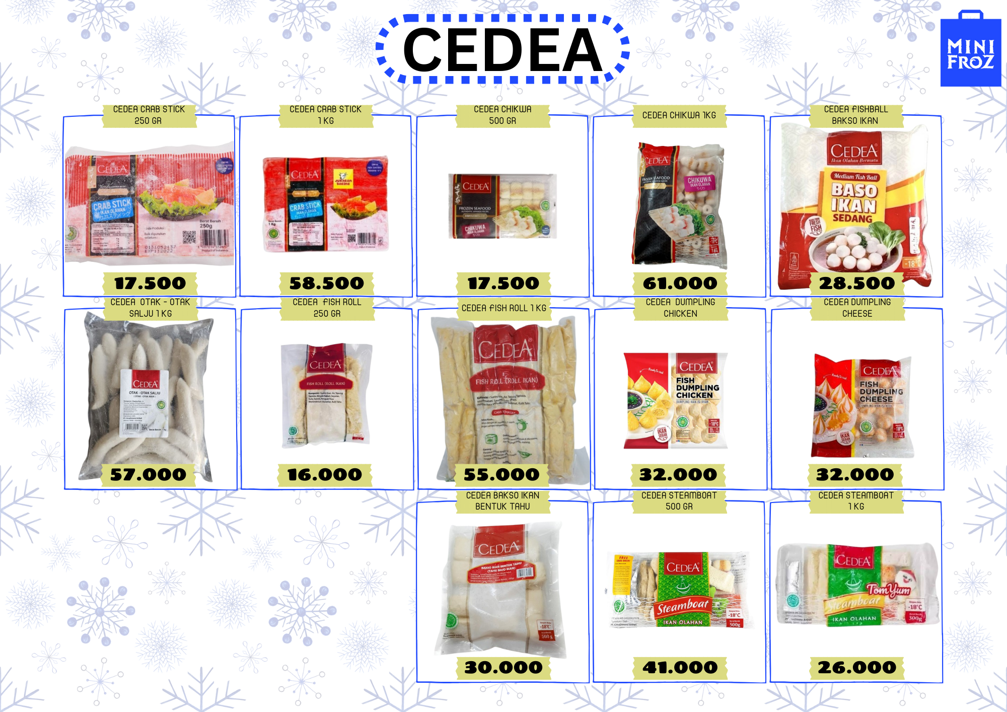 Harga yang tertera juga cukup terjangkau, mulai dari Rp 17.500 hingga Rp 61.000, tergantung jenis dan ukuran produk. Beberapa varian bahkan tersedia dalam kemasan MINI FROZ yang cocok untuk percobaan atau porsi kecil.