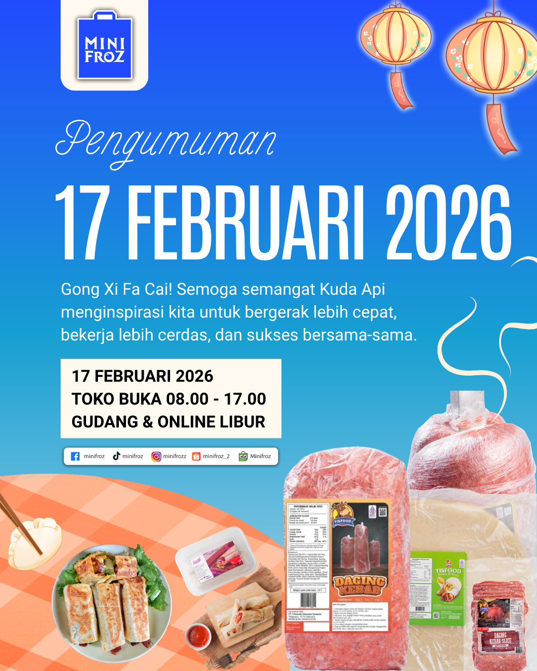 Melalui pengumuman resminya, Mini Froz menyampaikan pesan hangat bagi seluruh pelanggan setianya: “Gong Xi Fa Cai! Semoga semangat Kuda Api menginspirasi kita untuk bergerak lebih cepat, bekerja lebih cerdas, dan sukses bersama-sama.”