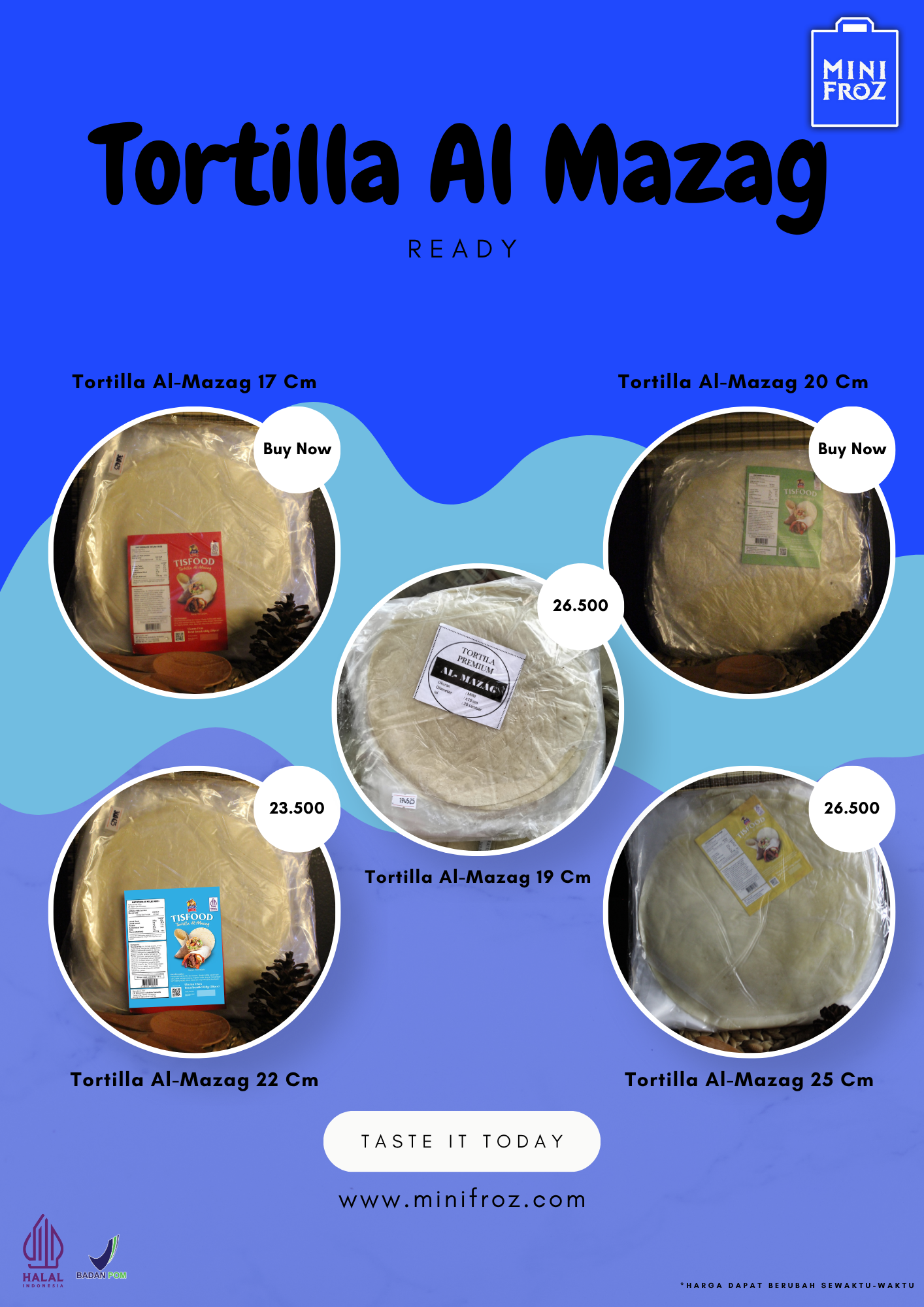 Tortilla Al-Mazag tersedia dalam empat pilihan ukuran, masing-masing dengan harga yang terjangkau: