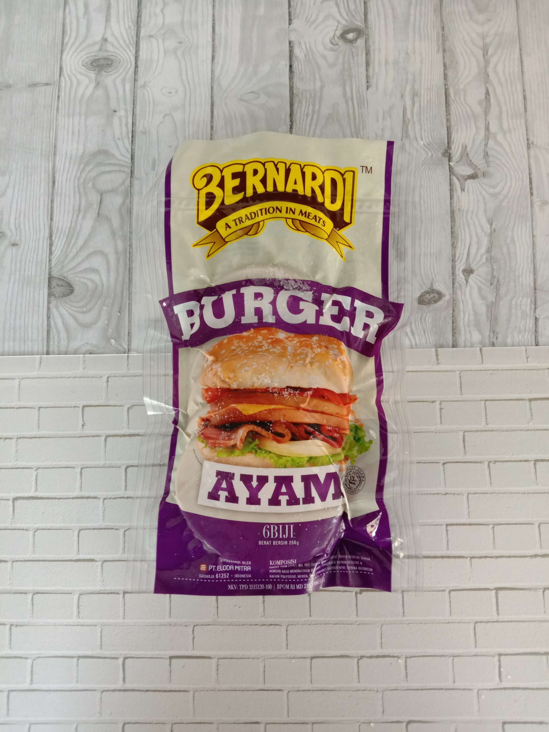 Dilihat dari kemasannya, Bernardi tetap mempertahankan desain klasik yang didominasi warna ungu dan kuning yang ikonik. Dalam satu kemasan praktis ini, Anda akan mendapatkan 6 biji (patty) dengan berat bersih 250g. Ukuran ini sangat pas untuk konsumsi keluarga kecil atau stok makan selama beberapa hari.